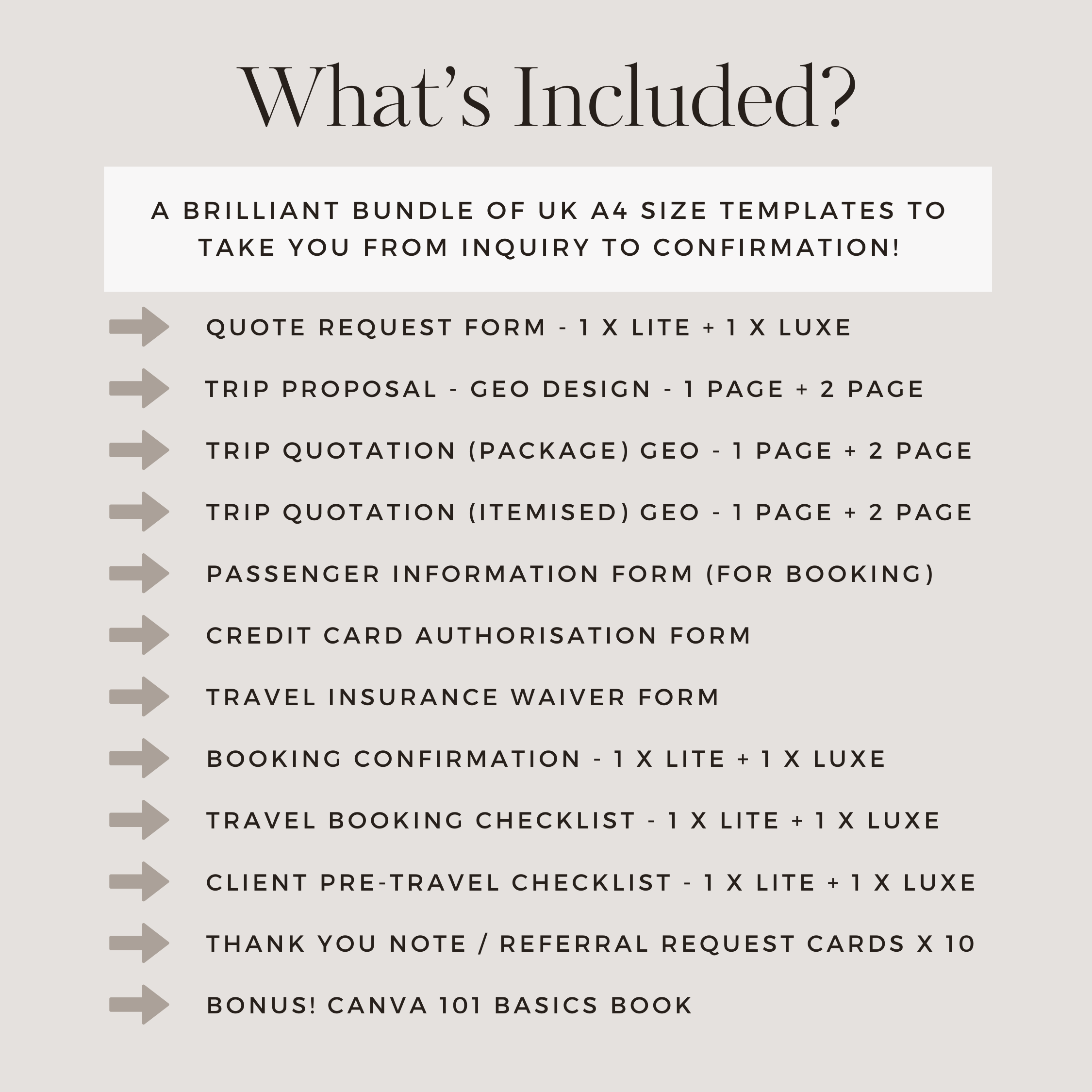 Everything a travel advisor needs for a streamlined customer booking journey! The bundle incorporates the GEO design in the UK format and includes initial enquiry forms, trip proposals, trip quotations and booking confirmations. In addition to essential documents like passenger information, credit card authorisation, and travel insurance waiver forms. Plus booking and travel check-lists and thank you / referral notes for encouraging repeat customers! Also included is the Canva 101 Basics Guide for those new to editing templates in Canva.